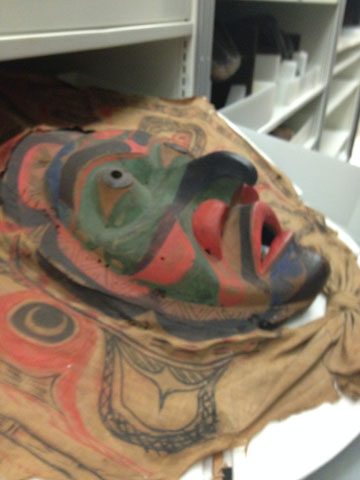 Spent most of the morning touring The National Museum of the American Indian's conservation facility in Suitland, Maryland. There's a huge number of beautiful objects there—clothes, baskets, beadwork, wooden boxes, wall hangings, cradles, canoes, and huge totem poles—and even ceremonial rooms and outdoor areas. This mask is from the Pacific Northwest, Tlingit or Haida I think.