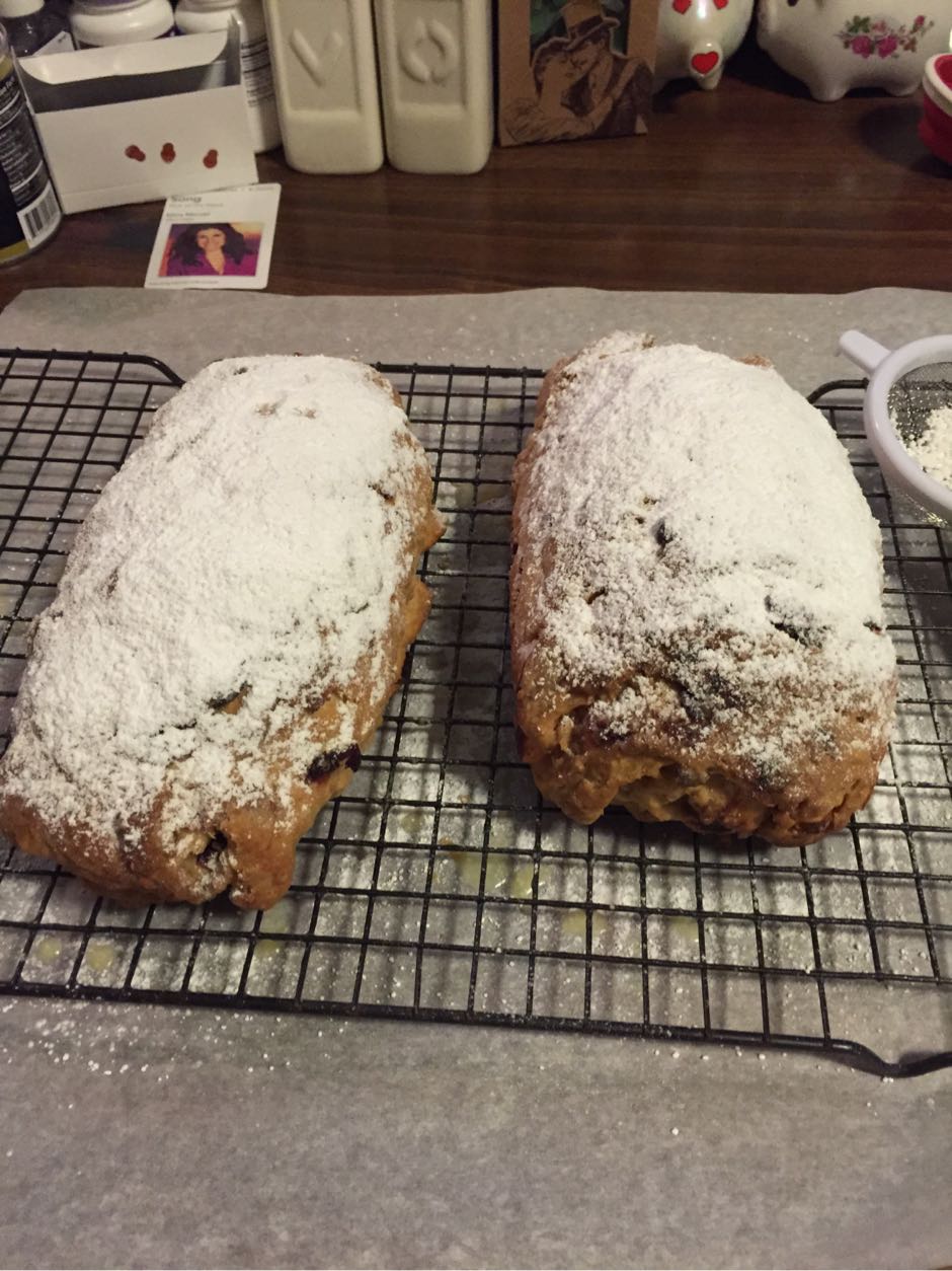I started my holiday baking with something that is new and ambitious, the Obsessivore's Fruitcake from Bon Appétit. The recipe is written like a bread—you add a tiny amount of yeast and work the dough like a bread—but there's less than three cups of flour for two loaves and 12 tablespoons of butter. The dough was stiff for me, but it rolled nicely (the loaves are filled with pistachio paste, which in itself was a discovery for me). Still that fruitcake name and the baking instructions, or until a knife inserted in the center comes out clean, make it seem more like a cake than a bread.